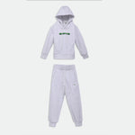 A black hooded sweatshirt and matching jogger pants set, laid flat on a light background. The hoodie features white text on the chest, and the joggers have a side pocket with a small label. The set has a casual and sporty design