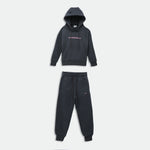 A black hooded zip-up jacket and matching jogger pants set, laid flat on a light background. The jacket has a small white logo on the chest, and the joggers feature a similar logo on the thigh. The set has a casual and sporty design